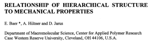 The selected peer-reviewed paper is the 1999 review article by Eric Baer, Anne Hiltner, and David Jarus, titled Relationship of Hierarchical Structure to Mechanical Properties. The core argument of the paper is that the mechanical properties of complex material systems originate from their hierarchically organized structure spanning from the nanoscale to the macroscopic level. The authors begin by systematically analyzing the intrinsic relationship between the outstanding performance of natural biological materials and their hierarchical structures. For instance, the six-level ordered structure of tendons provides excellent uniaxial tensile strength and toughness. Wood exhibits pronounced anisotropy due to the layered, orderly arrangement of cellulose from molecular chains to annual rings. Nacre achieves fracture toughness far exceeding that of its ceramic component through an alternating brick-and-mortar structure composed of inorganic platelets and an organic matrix. The article emphasizes that understanding the properties of these materials hinges on grasping three key elements: the scale of the structures, the interactions between different hierarchical levels, and the overall spatial architecture.