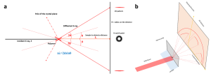 Figure 3: Schematic illustration of Bragg diffraction geometry and X-ray detection in a typical XRD experiment. (Left figure, basic mechanism of XRD, and right figure, SAXD)