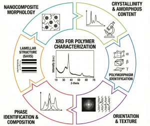 X-ray diffraction is widely used in polymer science to characterize different intrinsic properties of polymers. Because polymers vary greatly in morphology, XRD offers versatile applications across fibers, films, composites, blends, and recycled materials. Some of the common application areas are: determining the crystallinity in polymers, which helps correlate crystallinity with mechanical strength, melting behavior, stiffness, and barrier properties. It is used to study polymer blends, composites, and nanocomposites. Moreover, it can be used to analyze structural changes during thermal processing, allowing in situ observation of crystallization, melting, and annealing by tracking peak intensity, width, and position changes with temperature. Researchers also use XRD to compare virgin and recycled polymers, revealing differences that arise due to thermal degradation, multiple processing cycles, or contamination in recycled materials. Furthermore, they also use it for filler dispersion and phase morphology in composite systems, detecting crystalline reinforcement phases (e.g., talc, clay, graphene), their alignment under processing, and the effect of fillers on polymer crystallinity12.