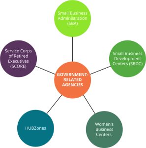 Governments at the federal, state, county, and municipal levels have established agencies and programs to encourage new business development, support new businesses in the early years of operations, and help young businesses mature to the point of self-sustainment. These include the SBA, Small Business Development Centers, Women’s Business Centers, and HUBZones. Figure 14.3 illustrates some of the government agencies that assist small businesses.