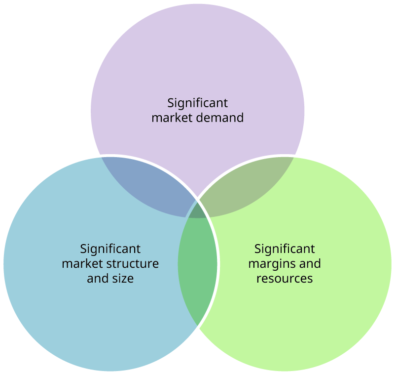 Significant market structure and size involve growth potential and drivers of demand for the product or service. Barriers to entry are manageable, meaning that entering the industry or creating a new industry is not exceptionally difficult. If the industry already exists, there must be room within the industry for your venture to gain market share by providing a value that creates a competitive advantage.