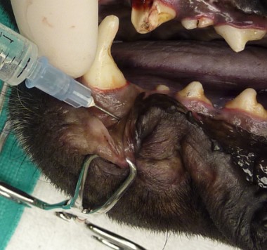 - Dorsal/ventral buccal branches of CN VII; *Note that the ventral buccal branch in the goat, calf, and pig courses along the ventral border of the masseter m.*
